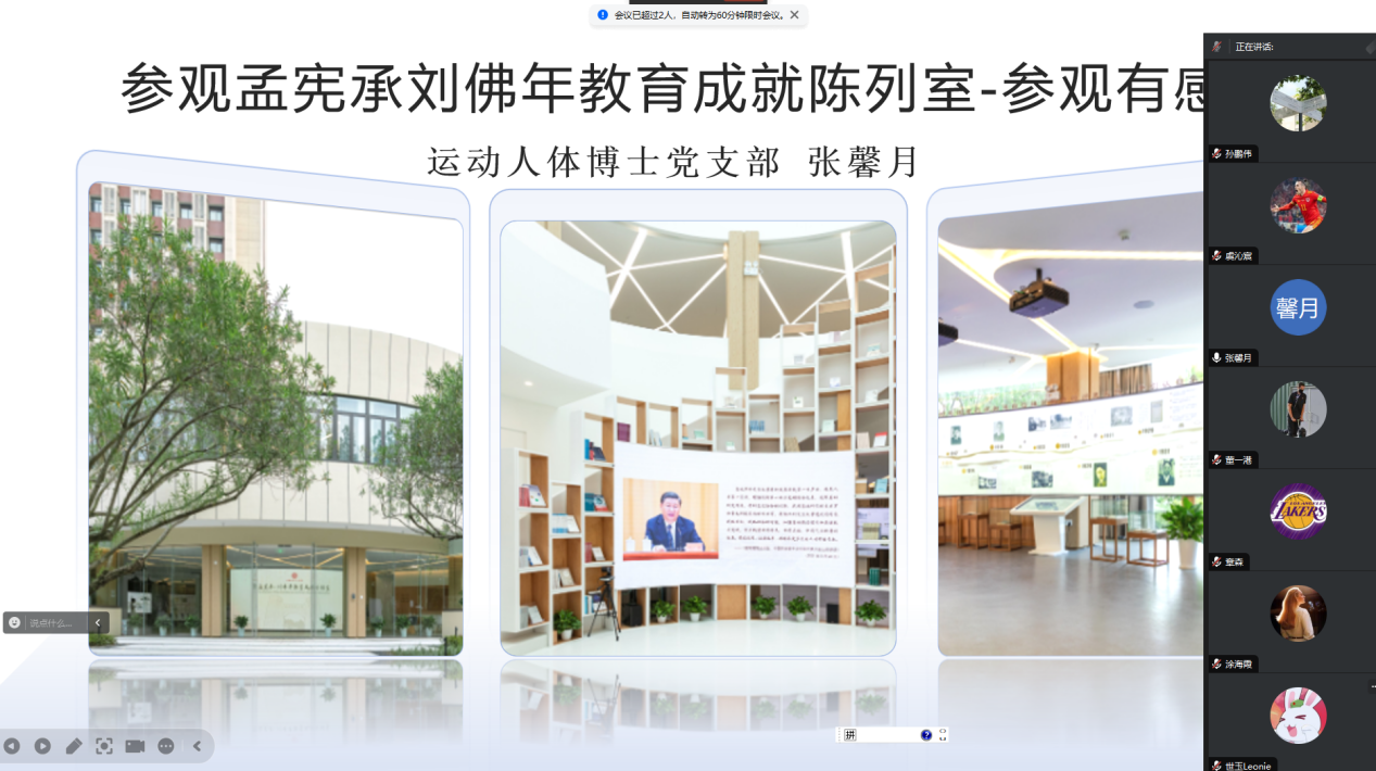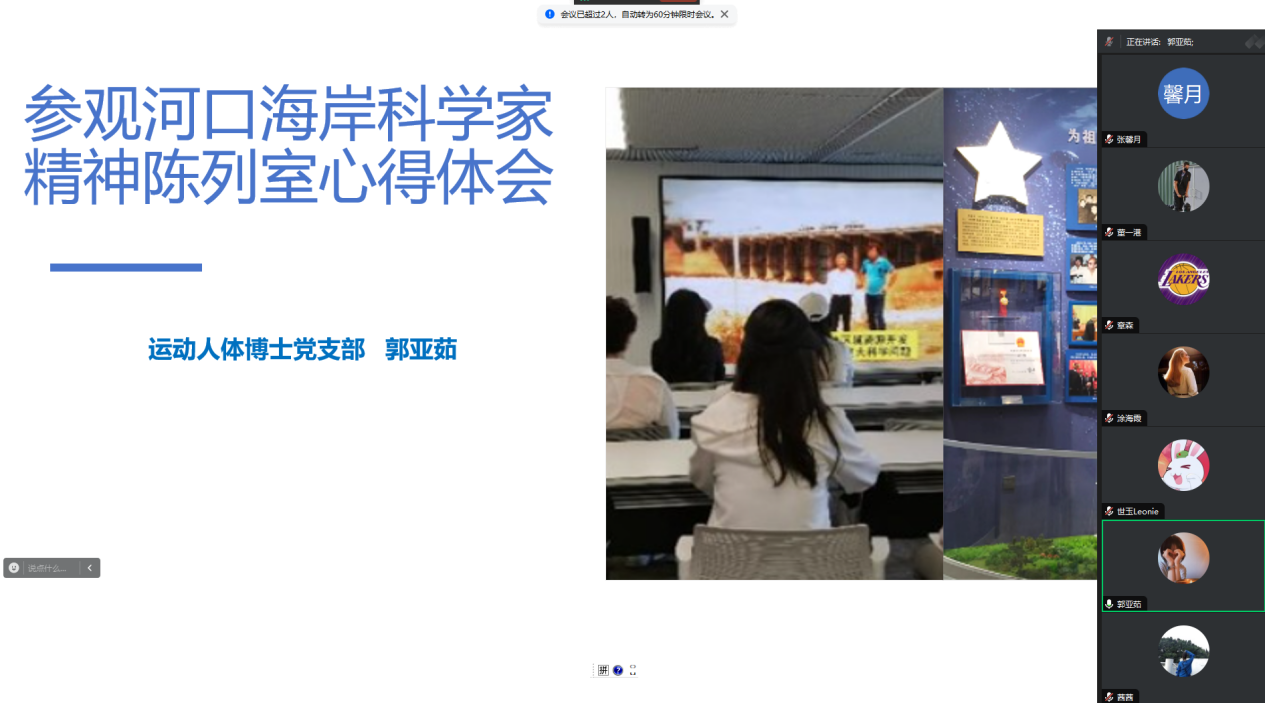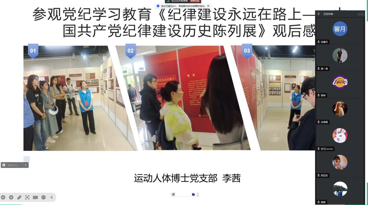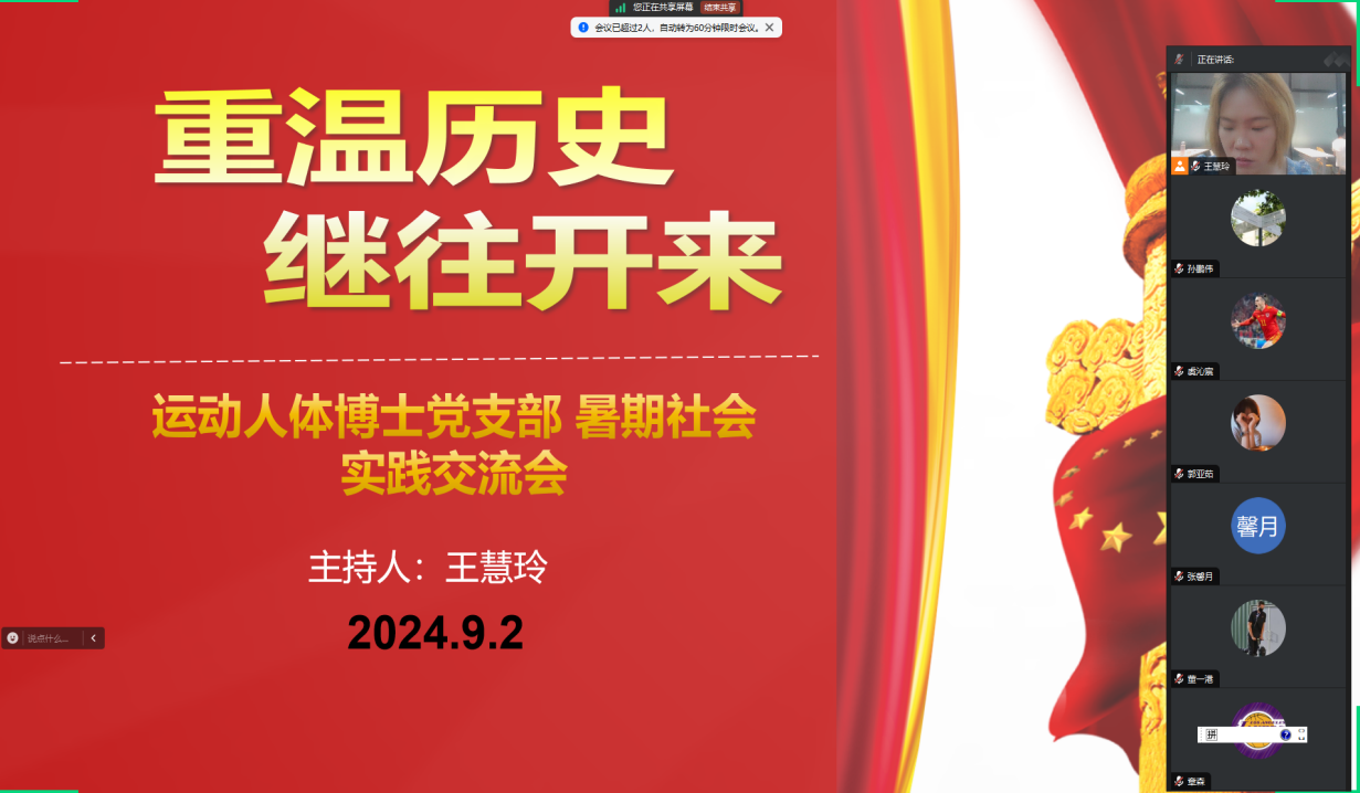 为积极响应教育部有关于深化高校学生暑期社会实践的相关要求与学校党委组织部指导意见,全面落实学院制定的《色情小说 师生党员基本培训实践教学工作方案》,进一步了解党的艰辛历程、光荣传统、宝贵经验和伟大成就,继承弘扬伟大建党精神,运动人体博士党支部于2024年9月2日以“重温历史,继往开来”为主题召开线上暑期社会实践交流会,支部党员对个人或小组的暑期实践经历进行总结并作交流分享,支部全体成员参加,会议由王慧玲同志主持。