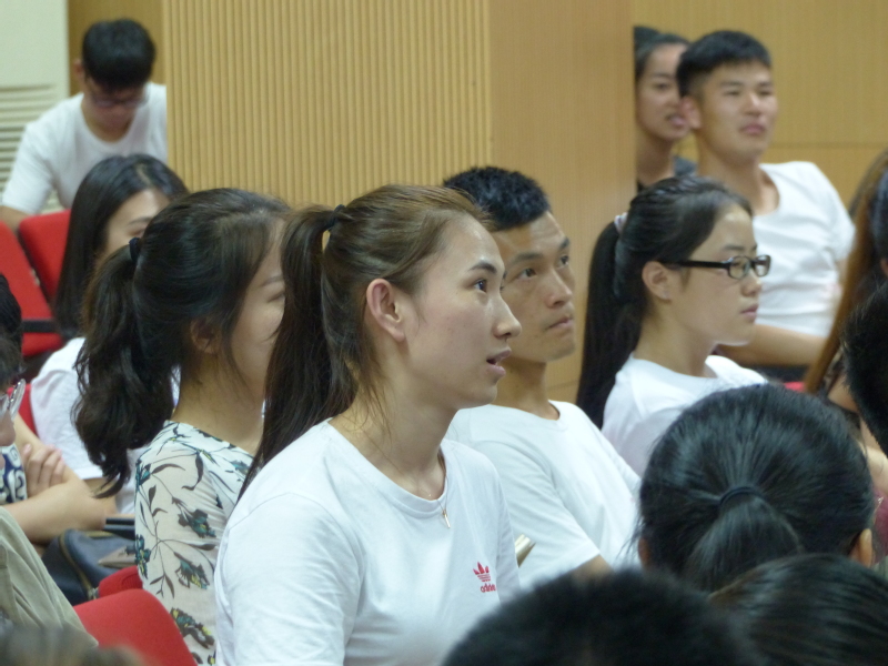 整个讲座气氛轻松活跃,潘教授的“美式幽默”经常引得在场学生捧腹大笑。此外,潘教授还与在场学生面对面交谈,同学们也积极提问,热烈的气氛达到高潮。当有学生提到运动品牌越来越潮流化而忽视功能性的问题,潘教授说这是由社会化决定的,“这个现象现在还存在于社会的很多方面”,潘教授解释道。在这个环节中,潘老师还和同学们探讨了许多讲座主题之外的话题,如“男性娘化”、“男女拥有不同价值观”的问题等。经过深入的探讨,大家都表示受益匪浅。最后,潘巍教授告诫年轻人要经历挫折、经历失败,在失败中收获经验,走向成功。